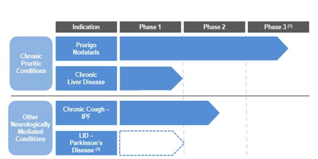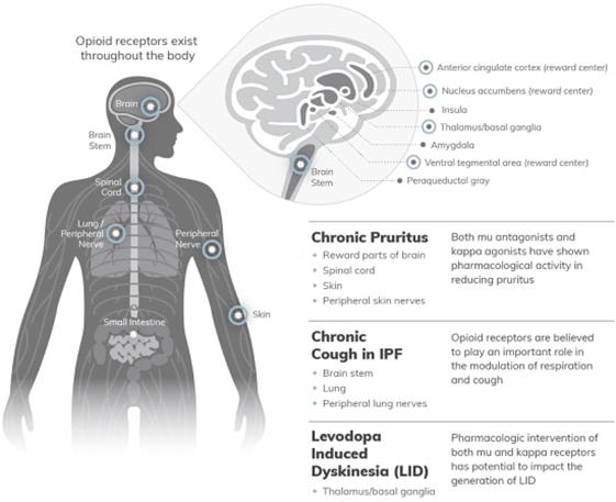 We are a clinical-stage biopharmaceutical company focused on the development and commercialization of nalbuphine ER to treat serious neurologically mediated conditions. We are developing nalbuphine ER for the treatment of chronic pruritus, chronic cough in patients with idiopathic pulmonary fibrosis, or IPF, and levodopa-induced dyskinesia, or LID, in patients with Parkinson’s disease. These conditions share a common pathophysiology that is mediated through opioid receptors in the central and peripheral nervous systems. Due to nalbuphine’s mechanism of action as a modulator of opioid receptors, we believe it has the potential to be effective in treating each of these conditions. We are currently conducting a Phase 2b/3 clinical trial of nalbuphine ER, which we refer to as the PRISM trial, in patients with severe pruritus associated with prurigo nodularis, and expect to report top-line data from the trial in the second half of 2020. If successful, we expect that we will use the PRISM trial and an additional Phase 3 clinical trial that we plan to conduct to support the submission of a new drug application, or NDA, to the United States Food and Drug Administration, or FDA, and a marketing authorization application, or MAA, to the European Medicines Agency, or EMA, for nalbuphine ER for the treatment of pruritus associated with prurigo nodularis.